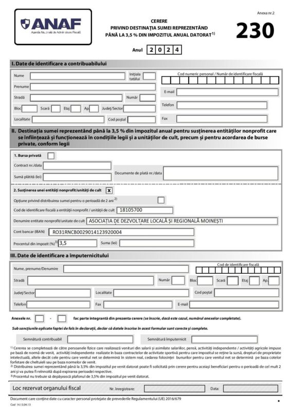 Formularul 230 este o declarație prin care poți redirecționa 3,5% din impozitul pe venitul tău anual către o organizație non-profit (ONG) sau o unitate de cult. Practic, este o modalitate de a dona o parte din banii pe care oricum îi plătești statului către o cauză care te interesează.
